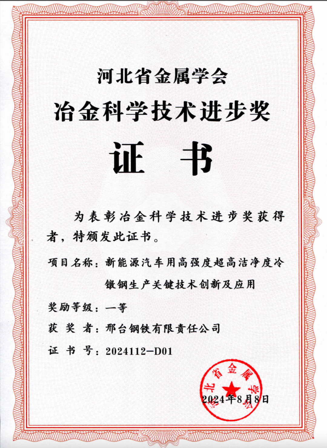 近日,邢臺鋼鐵有限責任公司兩項科技成果“新能源汽車用高強度超高潔凈度冷鐓鋼生產關鍵技術創(chuàng)新及應用”“高品質高碳特殊鋼線材夾雜物無害化及均質化控制技術開發(fā)及應用”得到河北省金屬學會專家評審委員會的高度認可,分別榮獲2024年度 “河北冶金科學技術獎”一、三等獎。